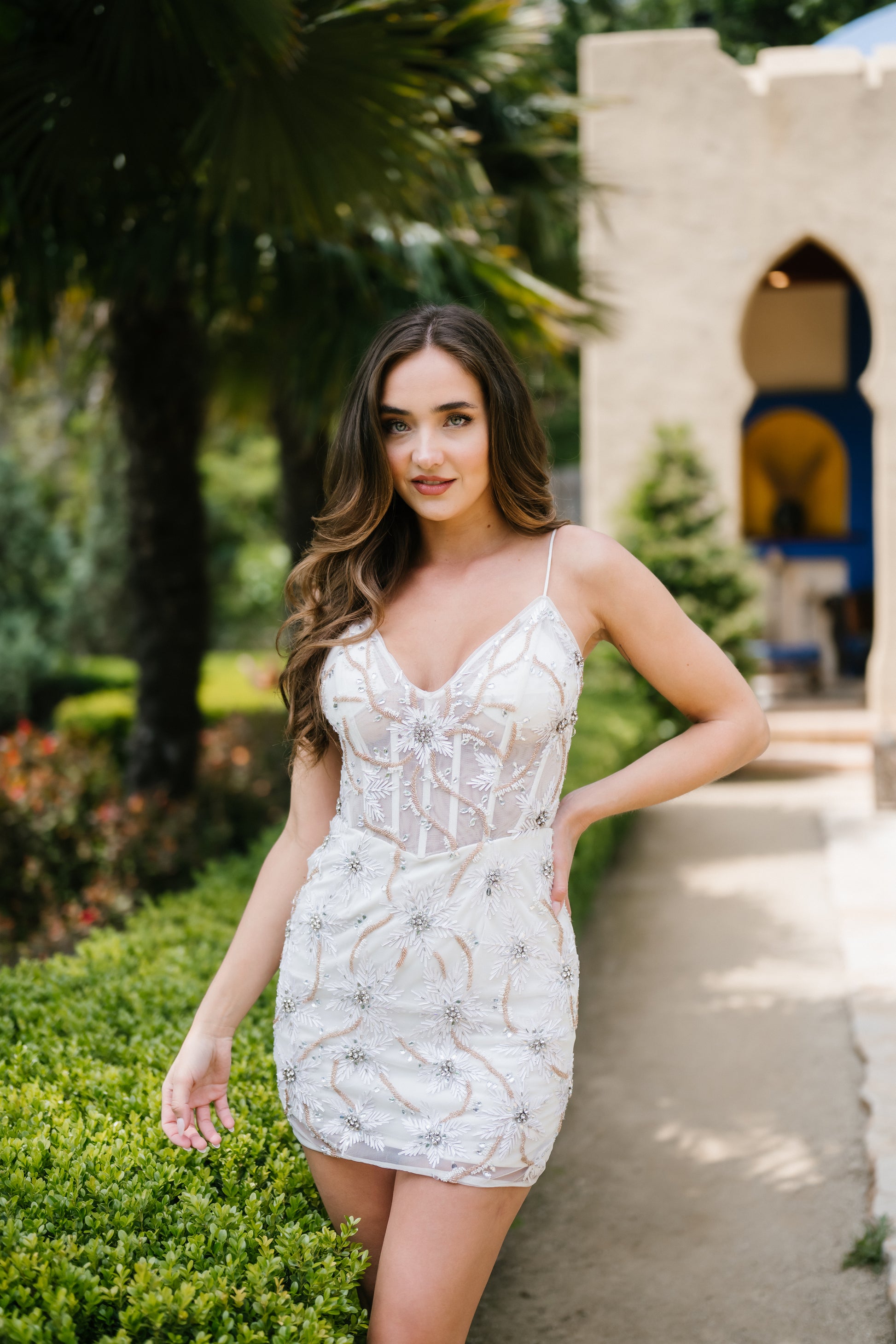 This dress features a short silhouette with a V-neck and straps, adorned with a geometric pattern all over for a modern and stylish look.
