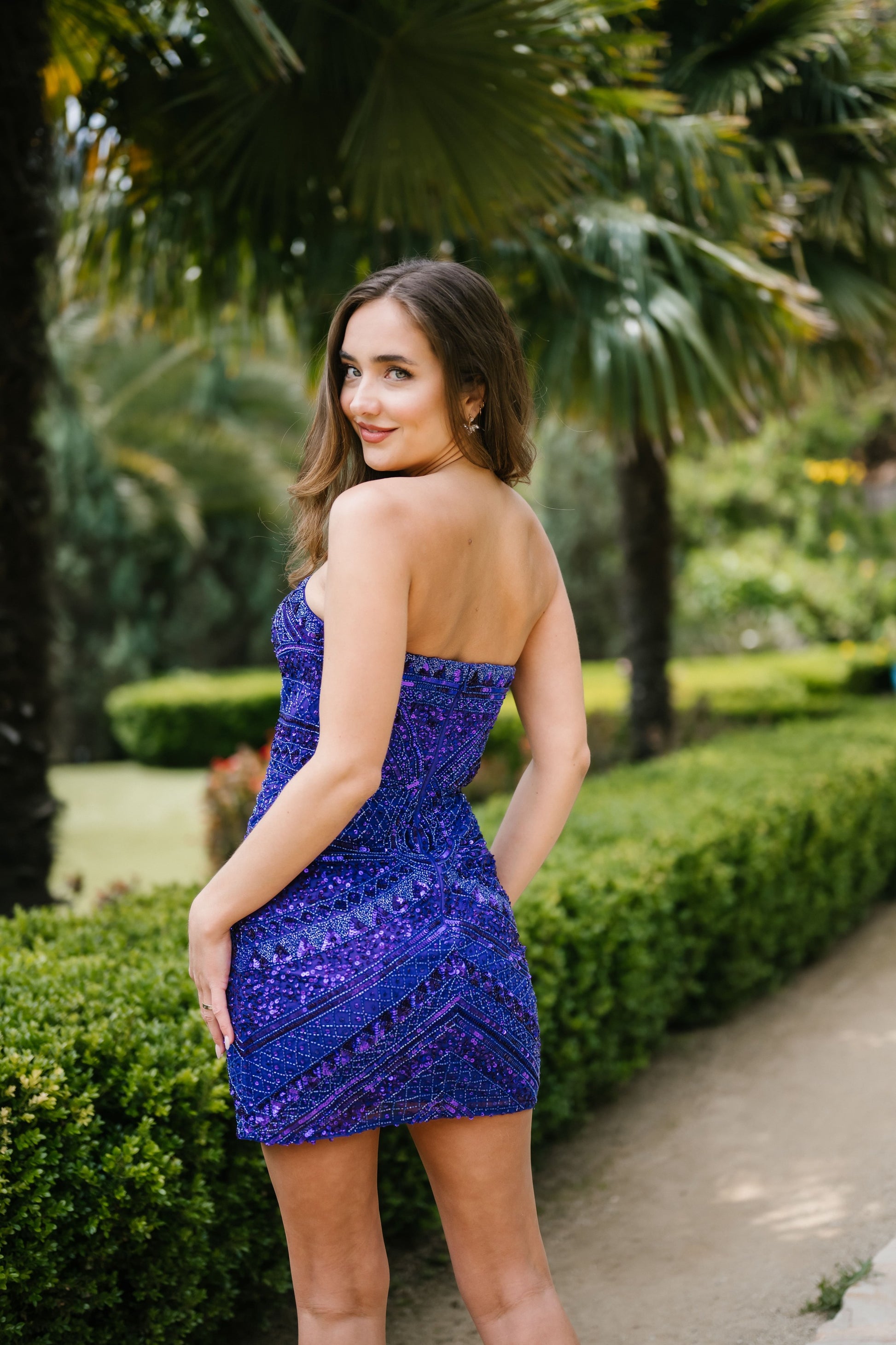 This dress features a short silhouette with a sweetheart neckline, strapless design, and an intricate pattern for a chic and elegant look.
