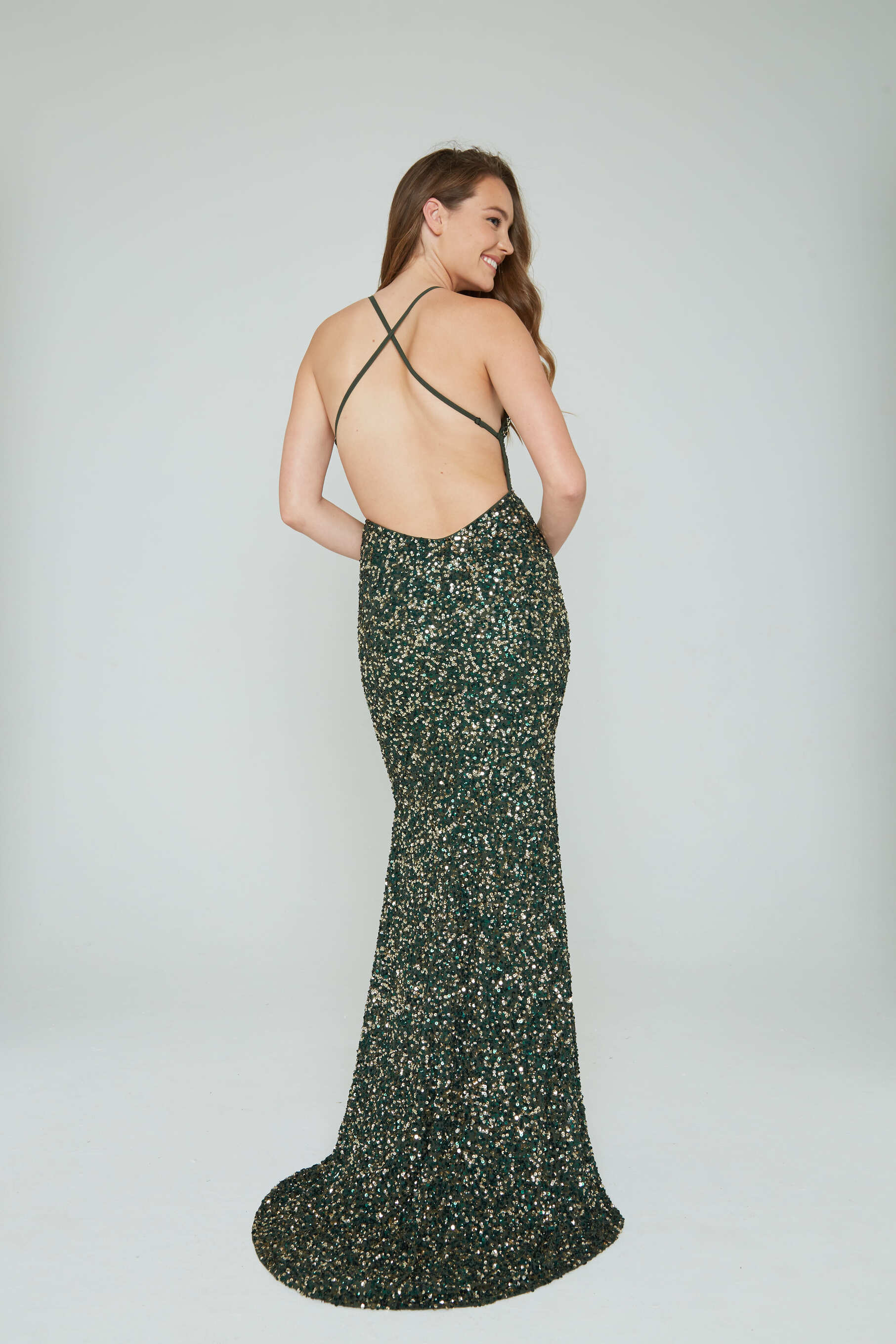 This dress is adorned with sequins throughout. It features a halter neck that criss-crosses at the back, complemented by a high slit for an elegant, modern finish.