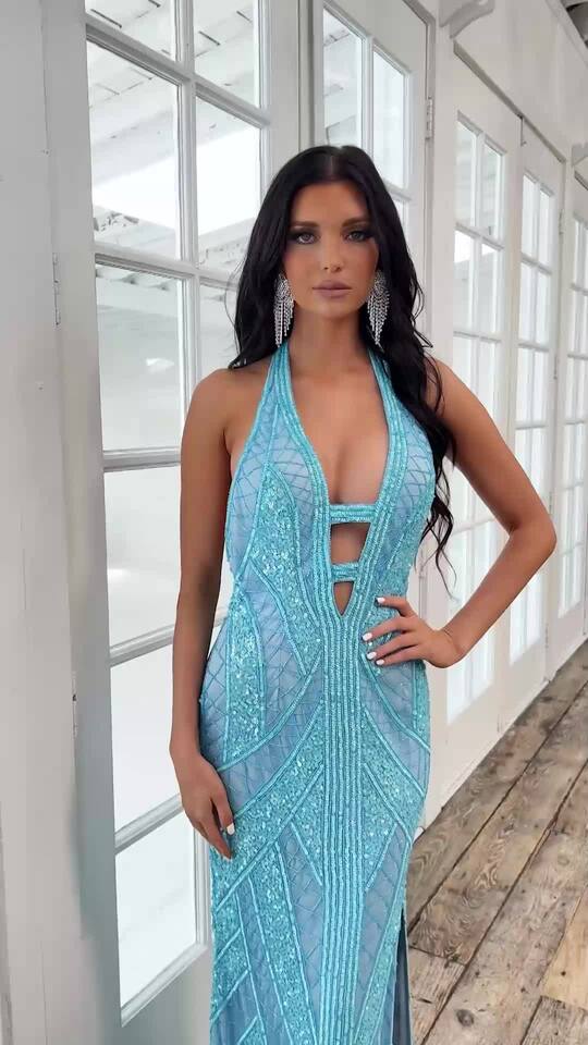 This dress features a geometric design, complemented by a plunging neckline with intricate detailing. A thigh-high slit and backless halter complete its bold, sophisticated look.