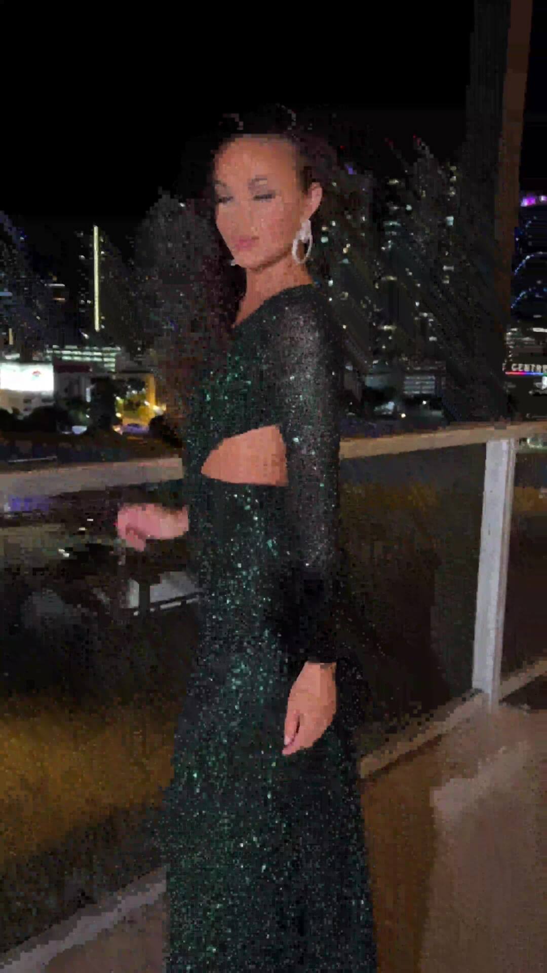 This dress features a V-neck and full sleeves adorned with sequins. A back cutout adds a modern touch, while the feathered sleeves enhance its elegant and playful design.