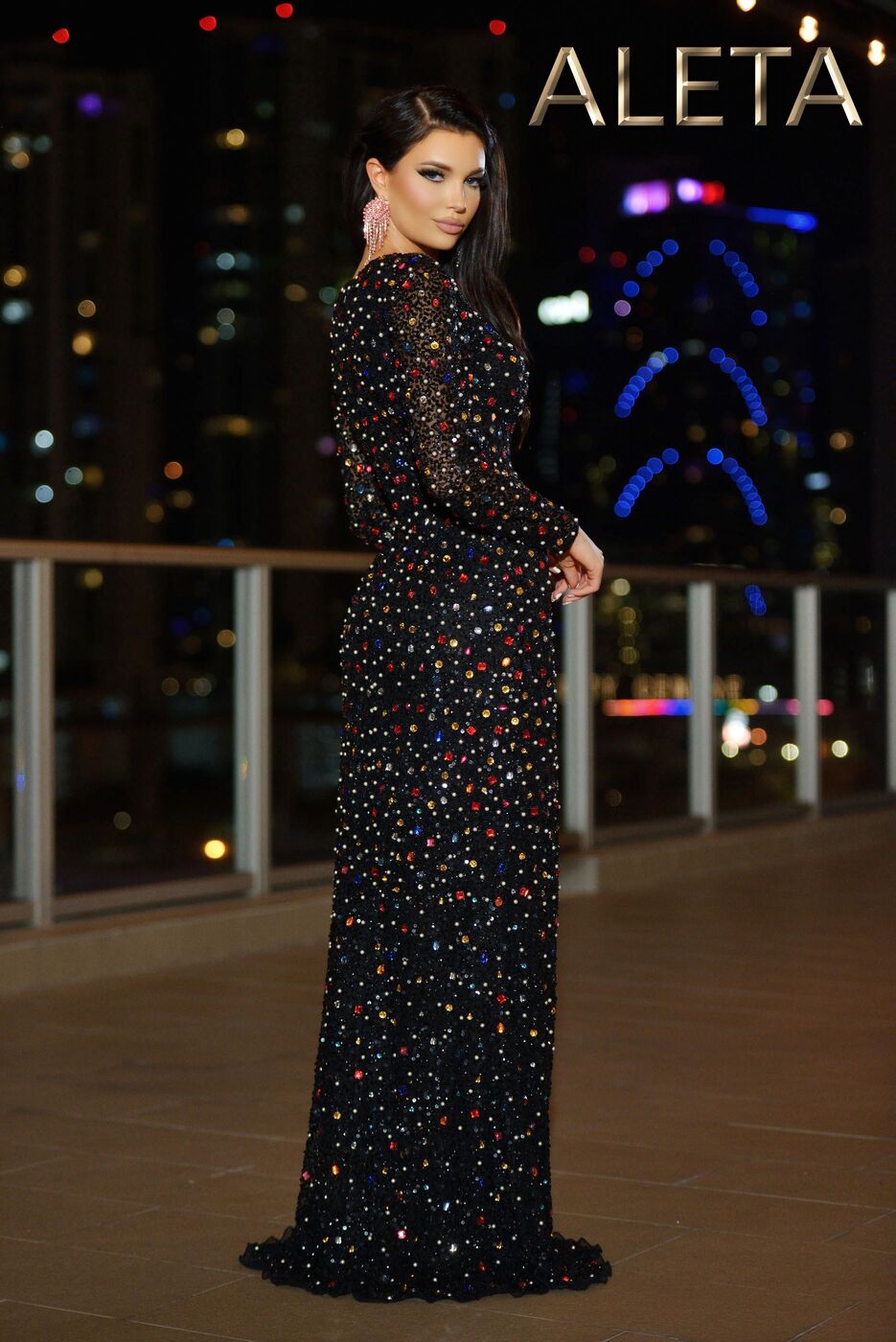 This dress features full sleeves and a thigh-high slit, complemented by a V-neckline. The multicolour polka dot pattern adds a fun and lively touch to its elegant design.