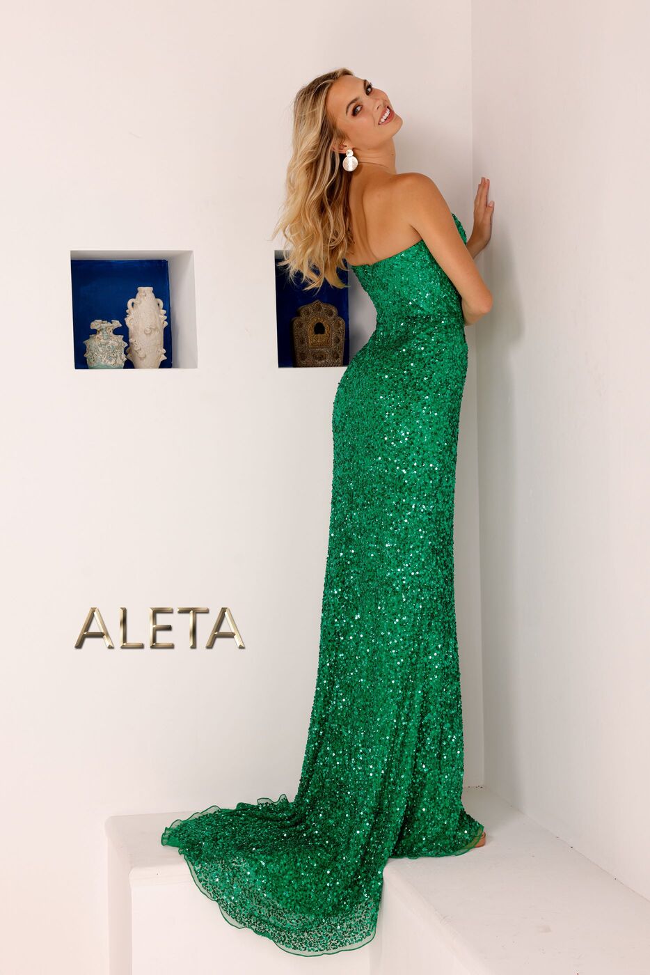 This dress features a sweetheart neckline and is adorned with sequins, complemented by a thigh-high slit. A small train adds an elegant finish to its glamorous design.