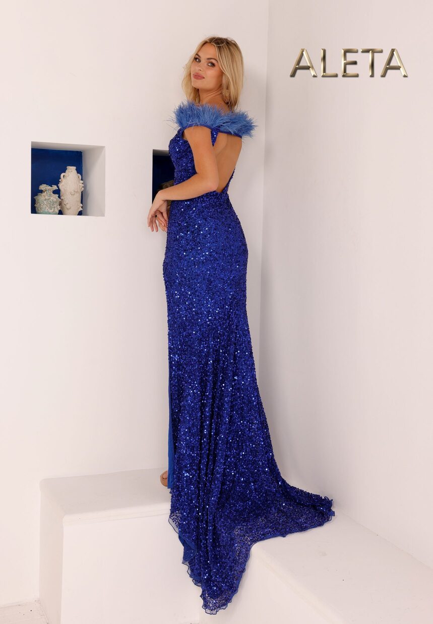 This dress features a V-neck with a sequined pattern. The body-hugging silhouette along with a thigh-high slit and net detailing on the front for a captivating and elegant look.
