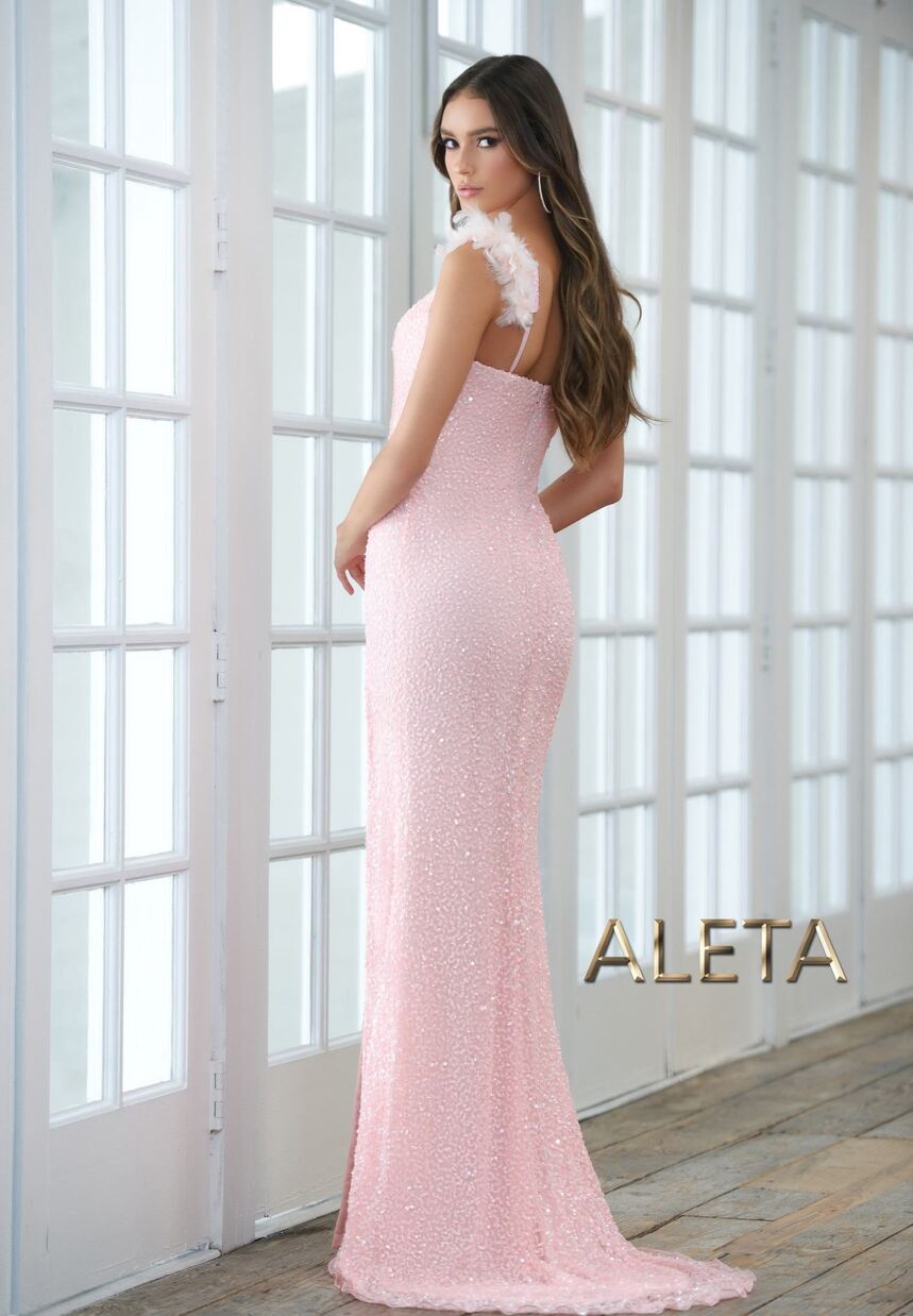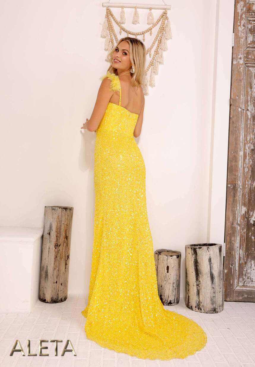 This body-hugging dress features an asymmetrical neckline and a thigh-high slit, beautifully adorned with sequins for a dazzling effect.